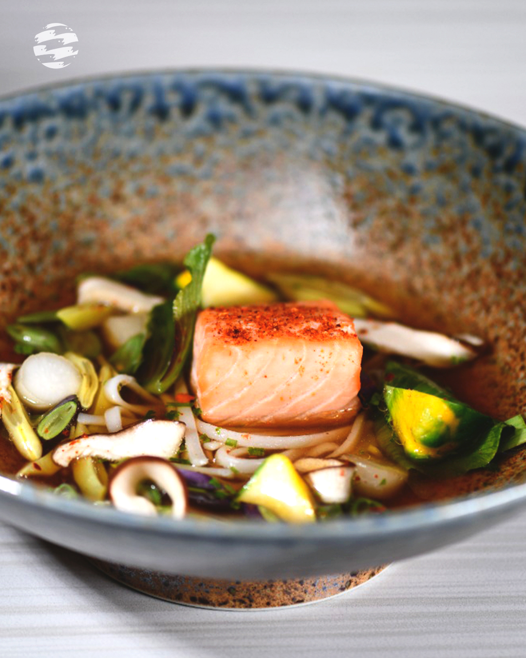 ? Ingredientes: salmón, fetuccinis, zapallito italiano, cebollín, rabanito, poroto verde, bruselas.